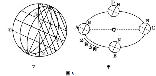 1、综合题 图8中甲为地球公转示意图、乙为太阳光照射地球示意图,读图完成下列各题。(共12分)