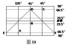 2、综合题 图13为某日太阳光照示意图,图中EDF表示晨昏线,且ED为晨线。读图回答。(10 分)