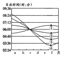 3、单选题 图为某半年四个不同纬度地区日出时间变化(a、b、c、d、e、f代表月份,且数值a>b>c>d>e>f)。读图回答13--14题。