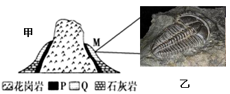 【小题2】若在图甲中M处发现了图乙中的岩石,则Q岩石为( )