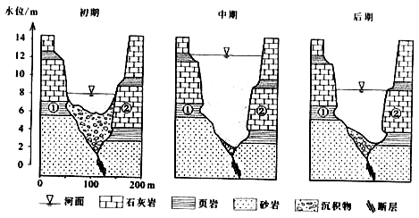 【小题2】图中信息显示,水位上升的中期,河谷中沉积物较少,说明河水的侵蚀和搬运能力较强,河流含沙量较大;水位下降时,河谷中沉积物较多,河流含沙量减少,搬运能力减弱,堆积作用增强;因河水在洪水期侵蚀能力增强,会使河床变宽、加深。