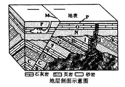 (1)该地层剖面图中的地质构造有______________________________________________;在地表处的横线上用箭头表示出岩层的受力方向。(3分)