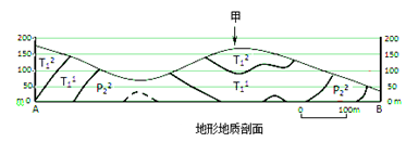 (1)在图中画出A—B一线的地形剖面图,并在垂直剖面图上画出岩层分布情况。(8分)