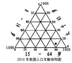 小题5:根据材料二提供的相关数据,在表的右上方三角坐标图上用圆点(· )标出我国当前人口年龄结构在图上所处的位置。