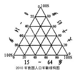 小题5:根据材料二提供的相关数据,在表的右上方三角坐标图上用圆点(· )标出我国当前人口年龄结构在图上所处的位置。