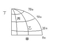 5、单选题 该图四地(甲、乙、丙、丁)中,6月22日正午太阳高度最大的是: