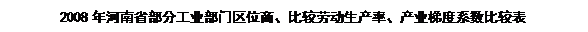 (2)从材料中可知纺织业、食品加工业的区位商和产业梯度系数都是表中最高的,这两个工业部门的比较劳动生产率也较高,因此这两个工业部门是河南省的优势产业部门。这两个产业部门之所以成为河南省的优势产业部门与河南劳动力丰富,农业大省,发展纺织、食品工业的原料丰富,地处中原,铁路公路交通便利,产业基础相对较好及政策支持有关。
