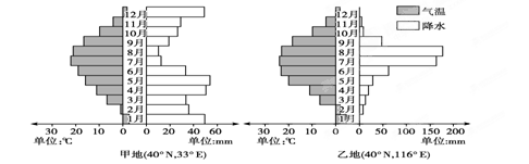 【小题1】读图可知,甲地最冷月气温低于0℃,夏季气温高,降水少,年降水量较少,在结合经纬度位置可知,应该为温带大陆性气候。乙地最冷月气温低于0℃,夏季高温多雨,在结合经纬度位置可知,应该为温带季风气候。