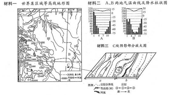 (3)根据材料三图例,b区域岩层中间老,两翼新,为背斜构造。背斜顶部受张力作用,岩石比较破碎而易被侵蚀成谷地,集水而成河流。