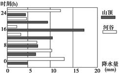 【小题1】由图可以看出:山顶降水最多是在16:00,山谷降水最多在0:00前后,即山顶白天多雨,河谷夜间多雨。选C正确。
