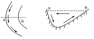 点评:本题难度较小,解答本题需掌握河流凹岸侵蚀、凸岸堆积的方法。河流流经弯道时,水流做曲线运动产生离心力。在离心力的作用下,表层水流趋向凹岸,冲刷凹岸使凹岸水面略高于凸岸,因此,底部水流在压力作用下由凹岸流向凸岸形成弯道环流。在弯道环流作用下,凹岸发生侵蚀,凸岸发生堆积,如图所示: