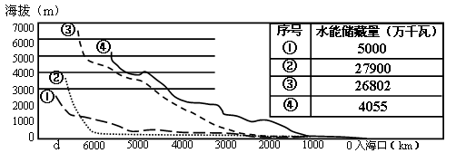 1、综合题  下图是“长江、黄河、尼罗河和亚马孙河的干流剖面图”及流域内水能蕴藏量表。读图表完成下列问题。(7分)