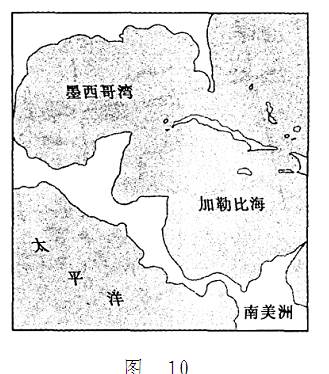 5、综合题 2010年4月20日,位于墨西哥湾的一座海上钻井平台起火爆炸,导致原油大量泄漏。图10为“墨西哥湾和加勒比海地区略图”。读图回答问题。(13分)