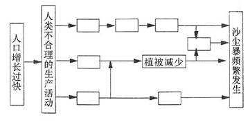 (5)图示地区沙尘暴近年来有频发趋势,将下列备选答案的字母代号填入沙尘暴成因联系图中的恰当位置。