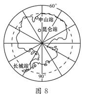 3、单选题 我国第二个南极科考站中山站(69°22′S,76 °22′ E),第三个南极科考站昆仑站(80°25′S,77°06′E)于2009年1月27日在南极内陆冰盖的最高点冰穹A地区胜利建成。读图,完成问题。