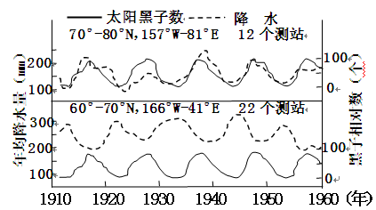 5、单选题 太阳黑子活动的变化会对地球的气候产生明显影响。下图显示北半球部分高纬度地区太阳黑子活动与年均降水量的关系。