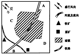(2)从矿产分布、交通运输、盛行风向、河流流向等因素综合考虑,B处最适宜发展的工业部门是_____