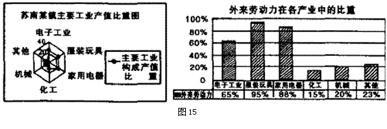 图15分别反映“苏南某城镇主要工业产值比重构成”和“外来劳动力数量的分布”,读图并回答下列问题。