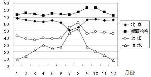 5、单选题 日照率是指一定时段内,实际日照总时数占可照总时数的百分率,下图为我国四地多年平均日照率月份变化统计图。读图完成下列小题。