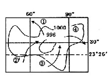 2、单选题 某区域海平面等压线分布图(单位:hpa),其中箭头表示的风向,正确的是