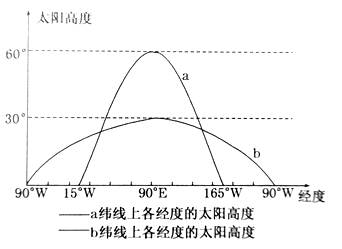 4、单选题 下图为某日某时北半球a、b两纬线上不同经度的太阳高度示意图。读图完成下列各题。