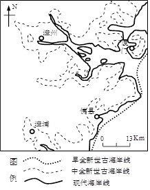 5、单选题 下面为全新世(开始于 91EXAm.org11.5万年前)以来福建省南部局部沿海海岸变迁状况示意图,读图回答题。