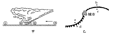 2.①地因离锋面较远,受冷气团影响不明显,故①地气温最高。④地未来将受冷气团控制。?乙图中a、b两地可能形成降水,c、d两地处在暖气团控制下,天气晴朗。城市因处在气旋中心区域,盛行上升气流,易形成阴雨天气。
