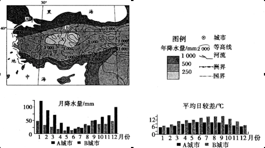 (2)(8分)比较A、B两市气温日较差的异同点,并分析原因。
