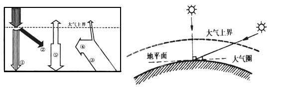 3、综合题 读“大气的热力作用图”和“太阳高度与太阳辐射经过大气路程长短的关系示意图”,回答下列问题。