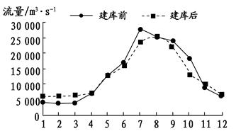 1、单选题 下图为三峡水库建成前后宜昌水文站多年月平均径流量图,判断三峡水库建成后通过宜昌站的水文状况是(? )