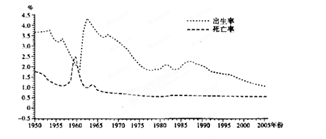 2、单选题 读“我国人口出生率和死亡率变化图”,回答问题。