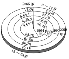 1、单选题 人口年龄结构是反映一个地区人口状况的重要指标之一,一般把65岁及其以上人口达到7%视为进入老龄化社会。下图为1964~2000年中国人口年龄构成变化图,据图回答小题。