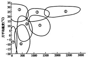 小题3:图⑦对应气温、降水数值,最热月气温 在 10℃ 以下,最冷月在 -20℃ ,终年降水较少,其对应气候类型可能是苔原带,即 C 选项正确。