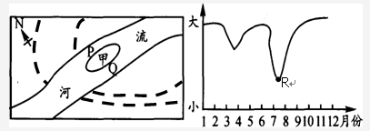 【小题2】首先该题分析需要注意指向标;当沙洲面积为R,表示为7、8月时,为汛期,故两岸潜水获得河流补给,则河流沿岸的潜水位较两边高,根据等值线“凸低为高”的原则,说明图示西侧等潜水位线数值低,而东侧等潜水位线数值较高,由此确定该河流自东向西流,在地转偏向力作用下,向右偏,则P河道受冲刷较严重,水深,而Q河道水流较缓,泥沙沉积,水浅。故选A项。