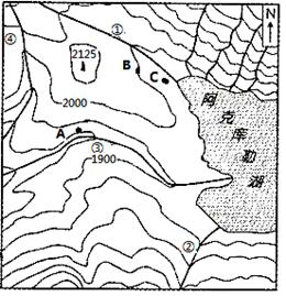 【小题1】该湖泊为内流湖,其补给主要是高山冰雪融水,所以其水位的变化受气温的影响大,A错;图中①②河流均注入该湖,B错;③河受湖泊的调蓄作用,河流水量相对平稳,所以④河与③河相比,流量的季节变化大,C正确;①河等高线稀疏,②河等高线密集,所以①河与②河相比,流速更慢,D错。