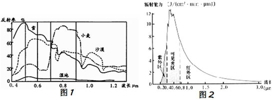 1、单选题 读“不同地物的反射光谱图”(图1)及太阳光谱(图2),回答问题: