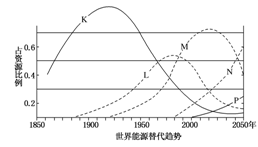 2、单选题  人类社会发展的不同阶段,其能源的利用主要种类有所不同,读“世界能源替代趋势”,其中K、L、M、N、P 5条曲线代表了石油、煤炭、太阳能、天然气、核能五种能源,读图回答下题。