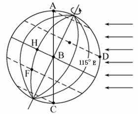 小题3:因AB是以晨线昏线连接点为中心点的晨昏线的一半,所以A、B都在赤道上,纬度都为0°;A、B之间的距离可能增大也可能减小;C、D的纬度位置在南北回归线之间移动。选项C正确。