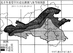 1、单选题 水分在地表结冰而不能渗入土壤,会使麦苗窒息或遭受冻害。为指导农民科学、合理地进行灌溉,中央气象台适时发布北方冬麦受旱区适宜灌溉气象等级预报。下图是中央气象台发布的2011年2月20日—24日的预报图,读图回答下列各题