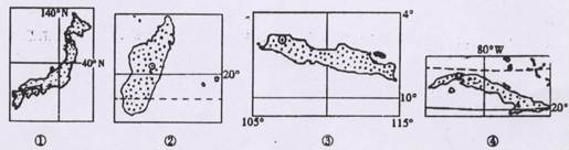 小题1:当北京地区坐北朝南的房屋内,正午阳光照射面积最大时,即当地的正午太阳高度最小,为北半球冬至日时,则正午太阳高度的全球分布规律为:自南回归线上向南北两侧递减,结合选项中各地的纬度位置即可判断,①位于40°N附近,为日本;②位于20°S附近,为马达加斯加岛;③位于4°S--10°S,位于马来群岛群岛;④位于20°N---23°26"N,位于西印度群岛。
