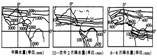 (1)(8分)6-8月受来自南半球(大西洋)东南信风越过赤道右偏形成的西南季风的影响导致降水多出现雨季 (4分);12-次年2月受东北信风影响,由陆地吹向海洋,降水少,形成旱季 (4分)