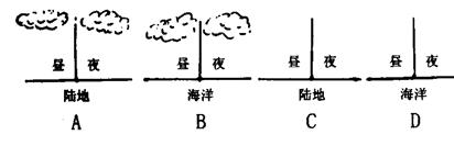 昼夜温差与下垫面的热力性质、天气状况、昼夜长短等密切相关,在天气状况相同的情况下,陆地比海洋昼夜温差大,因为陆地比热容比海洋小,传热方式单一,温度变化幅度大,图中A比B大,C比D大;在地表性质相同的情况下,晴天比阴雨天大,因为阴雨天白天云层增强对太阳辐射的削弱作用,气温偏低,晚上云层增强大气逆辐射,保温增强,气温偏高,昼夜温差小。所以C比A大。故选C。