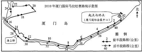 2、单选题 2010年厦门(24°27/N,118°06/E)国际马拉松赛事于北京时间1月2日上午8时鸣枪开赛。图为“2010年厦门国际马拉松赛路线示意图”和“某女运动员比赛过程即时素描图”。当该女运动员到达全程赛事终点时,她的身影朝向正北并大致与身高相等。读图回答10—12题。