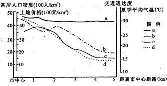 1、单选题 该图为我国长三角地区某城市人口密度、土地价格、交通通达度、夏季平均气温变化图,读图回答问题。