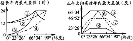 小题1:可通过简单计算验证即可。各地昼长年内的变化特征,赤道(0°)上全年昼夜等长,昼长年内变化为0时;66°34′-90°纬度范围内会出现极昼极夜现象,昼长年内变化都为24小时,所以各地昼长年内最大差值随纬度变化的曲线是③曲线。各地正午太阳高度年内最大差值变化特征,赤道上二分日正午太阳高度最大,为90°,二至日最小,为66°34′,最大差值为23°26′;北回归线(23°26′N)上,夏至日正午太阳高度最大,为90°,冬至日正午太阳高度为最小,为43°08′,最大差值为46°52′;同理,可以计算验证66°34′和90°纬度正午太阳高度年内最大差值,⑦线最符合此规律。