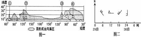 1、单选题  我国是世界上受台风影响最大的国家之一。图一为“北半球易形成台风海区分布示意图”;图二为福建某城市在此次台风天气过程中的风向和风力变化图。风杆(长线段)上绘有风尾(短线段)的一方指示风向。每一道风尾表示风力2级,一个风旗表示风力8~12级。读图,回问题。