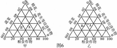2、综合题  下图中甲图是安徽某地种植业播种面积变化,乙图是该地种植业产值结构变化,两图中A都代表1999年情况,B都代表2007年情况。据图分析:
