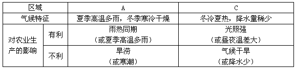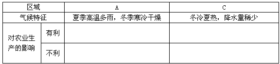 (3)分析比较图中A、C两地气候特征差异对农业生产的影响。