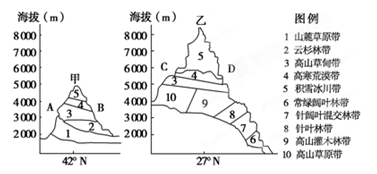 (2)乙 山为喜马拉雅山,D坡为南坡,由于纬度低,相对高度大,自然带数目多。B坡雪线低主要是由于位于偏北风的迎风坡;