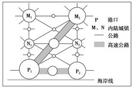 小题1:图中P1与P2因有高速公路连接,故服务范围有重叠之处,因连接干线有差异,故并非均衡地向四周发展;运输干线的发展有前后之分,而高速公路是因城市之间发展需求而兴建;P1与M2有高速公路连接而P2没有,故P1的服务人口大于P2。选C。